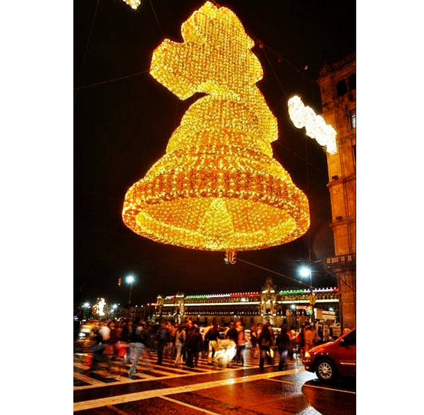 CAMPANA ALMA DE ACERO COMPLETA DE 2M , CON ESCARCHA PREMIUM DORADA DE ALAMBRE, ESCUDO METALIZADO DE 50 CM DE DIÁMETRO CON MANGUERA LUMINOSA.