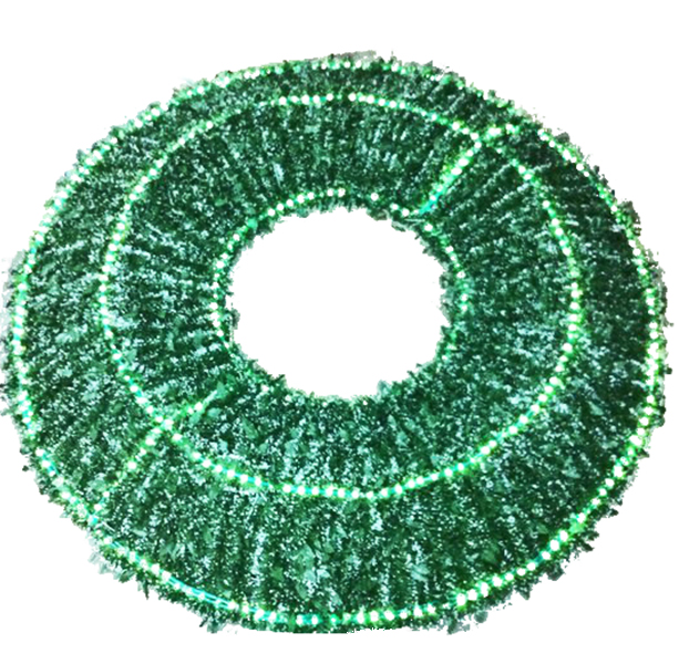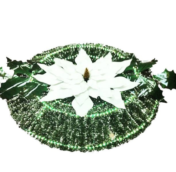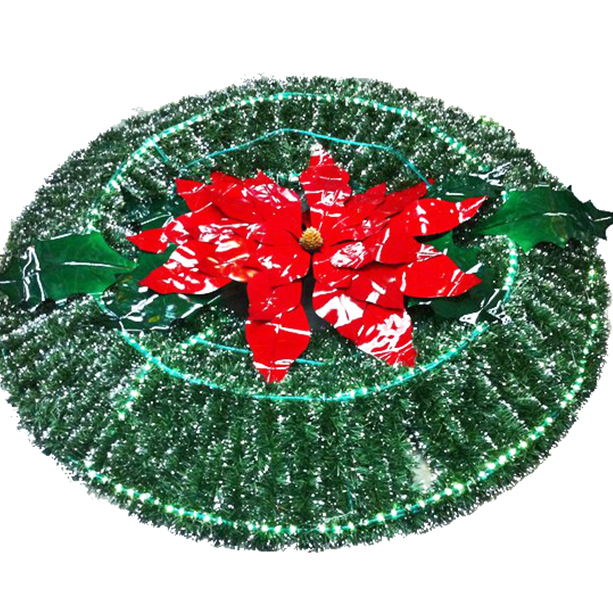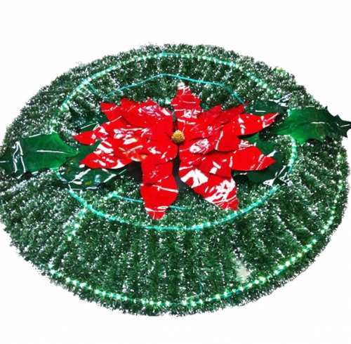 CORONA CON BASE DE ALAMBRON FORRADA CON ESCARCHA VERDE PINO, CON PUNTAS BLANCAS, CON NOCHEBUENA PLASTIFICADA EN EL CENTRO Y MANGUERA LUMINOSA.