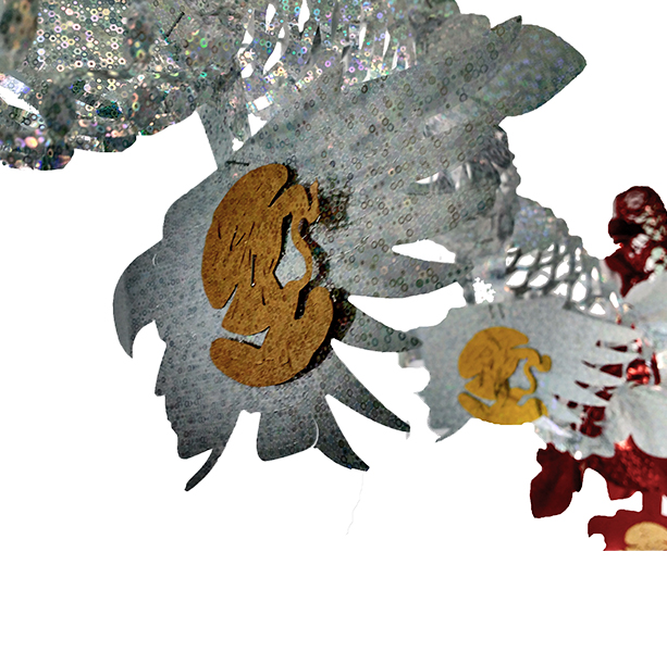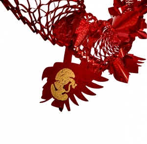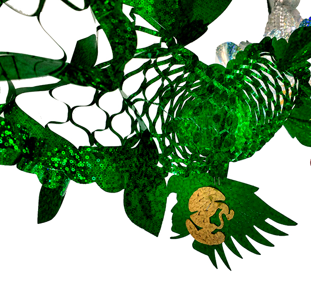 GUIRNALDA METALIZADA TRICOLOR CON FIGURAS DE HÉROES COLGANDO EN COLOR ORO.